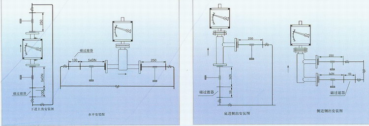 流量計(jì)應(yīng)垂直安裝,流量計(jì)中心線與鉛垂線的夾角不超過(guò)5°。在累計(jì)的上游須保證五倍公稱通徑的入口直管段,下游保證